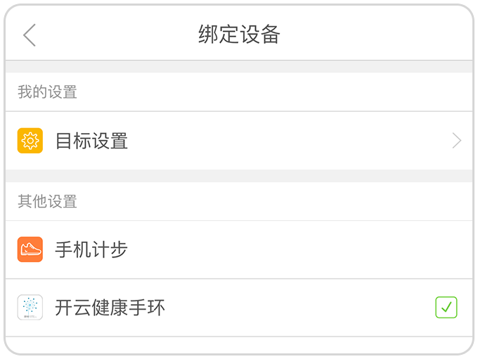 4.绑定设备:绑定手环或选择手机记步,手环关机等设备连接状态修改。