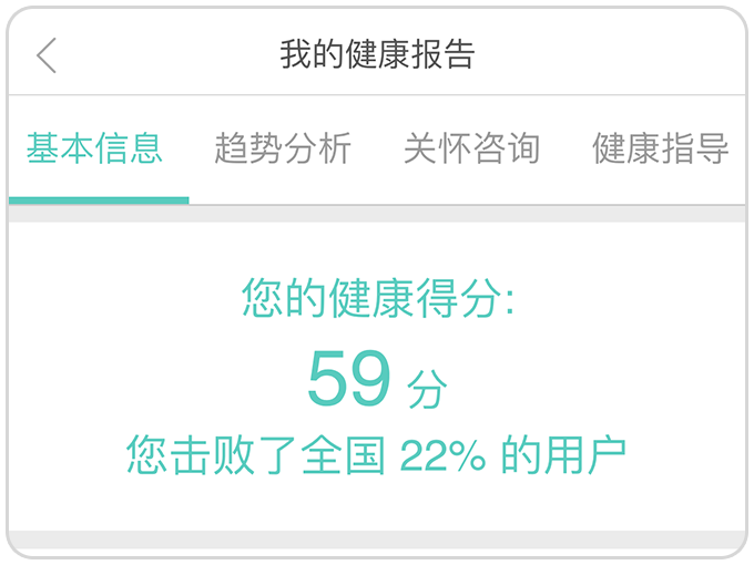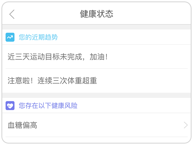 3.健康状态:将会列出您近期的健康趋势、疾病风险、生活方式风险因素等,综合分析您的健康状态。