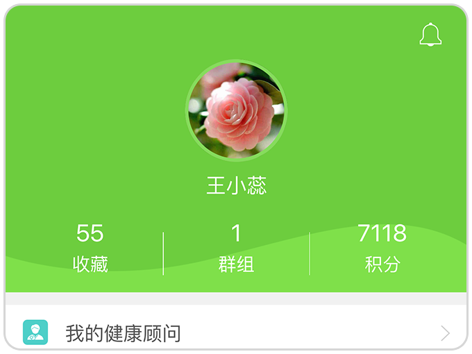 1.个人:点击头像,您可以编辑自己的头像、昵称、绑定手机号、修改基础资料等。头像下方也会显示您收藏的健康资讯、您所在的群组数量以及您的个人积分,积分可以兑换相应的奖品。