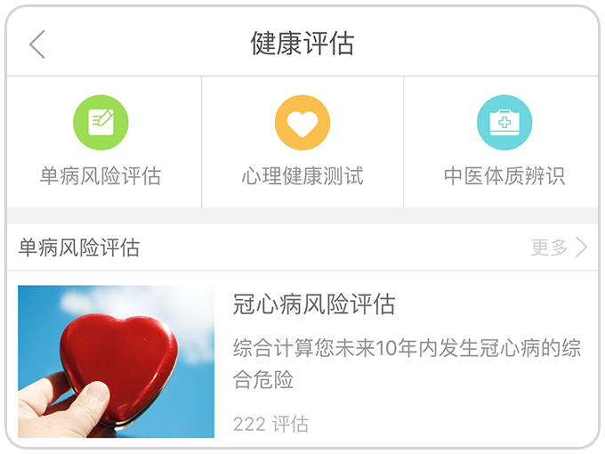 5.健康评估:提供疾病风险、心理健康、中医体质辨识等多种评估问卷,方便您为自己进行更为全面的健康评估。