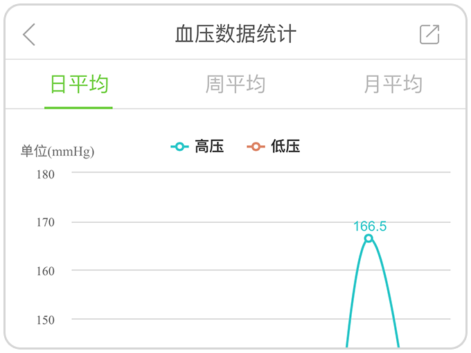 6.数据统计:任一模块子界面下方“历史记录”显示每次测量的数据记录;“数据统计”显示日平均、周平均、月平均数据趋势图。
