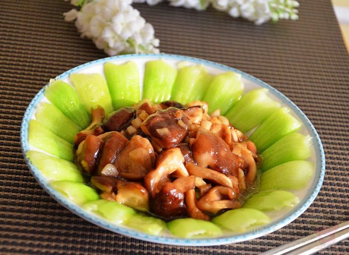 11. 将炒好的香菇倒在摆好盘的油菜上,一盘造型美观、味道鲜美的香菇炒油菜就做好了。