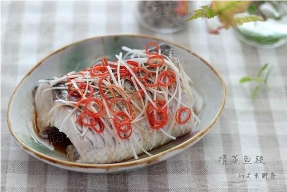 4. 蒸好的草鱼段滗去盘中的汤汁,上面的葱姜拣去不用。