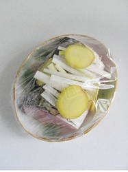 2. 草鱼段放上葱和姜,覆上保鲜膜。
