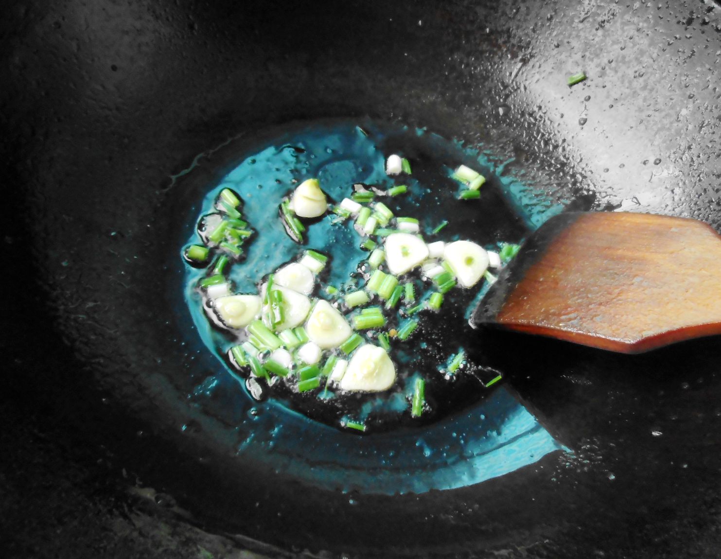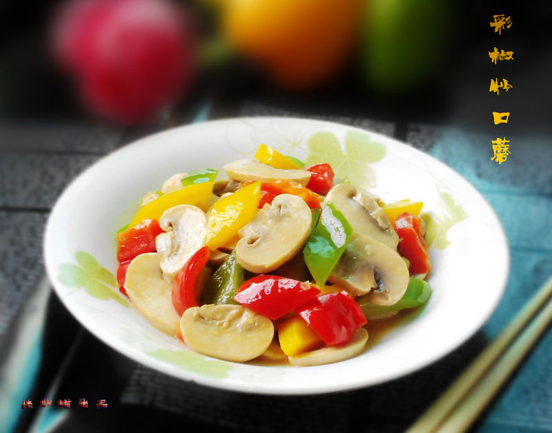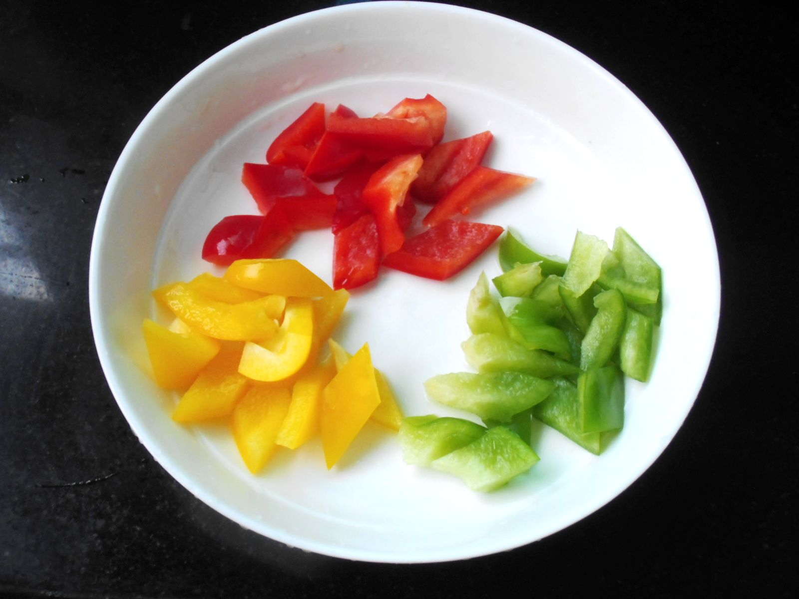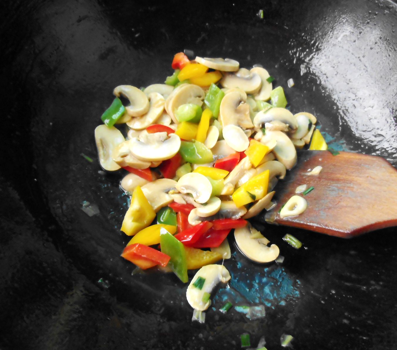 9. 接着放入彩椒炒至断生;加盐、鸡精调味即可。