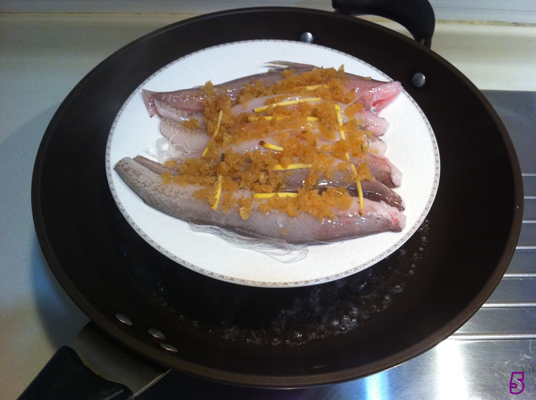 4. 在鱼身上撒放上姜丝和冬菜;
