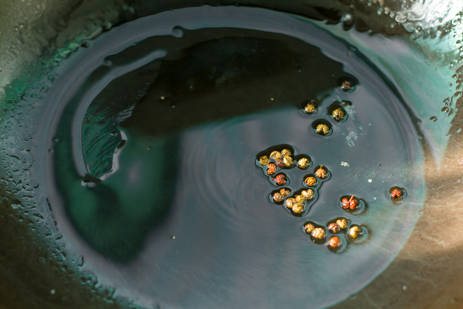 7. 趁热在锅里烧一勺热油,放点花椒粒一起烧热。 | ![]() |