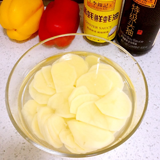 4. 切好的土豆片用水冲洗掉淀粉,泡在水中备用。 | ![]() |