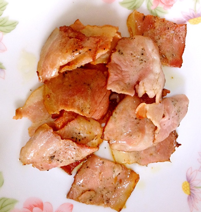 8. 热锅凉油,放入培根煸炒,熟后盛出备用。 | ![]() |