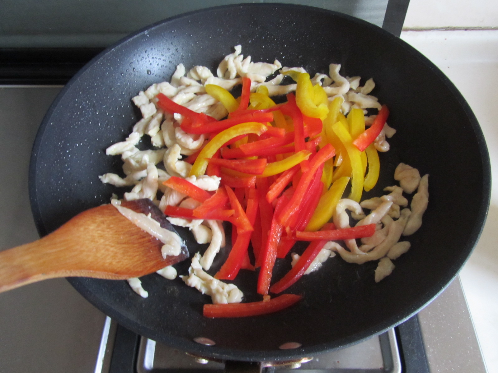 6. 加入红黄彩椒丝;