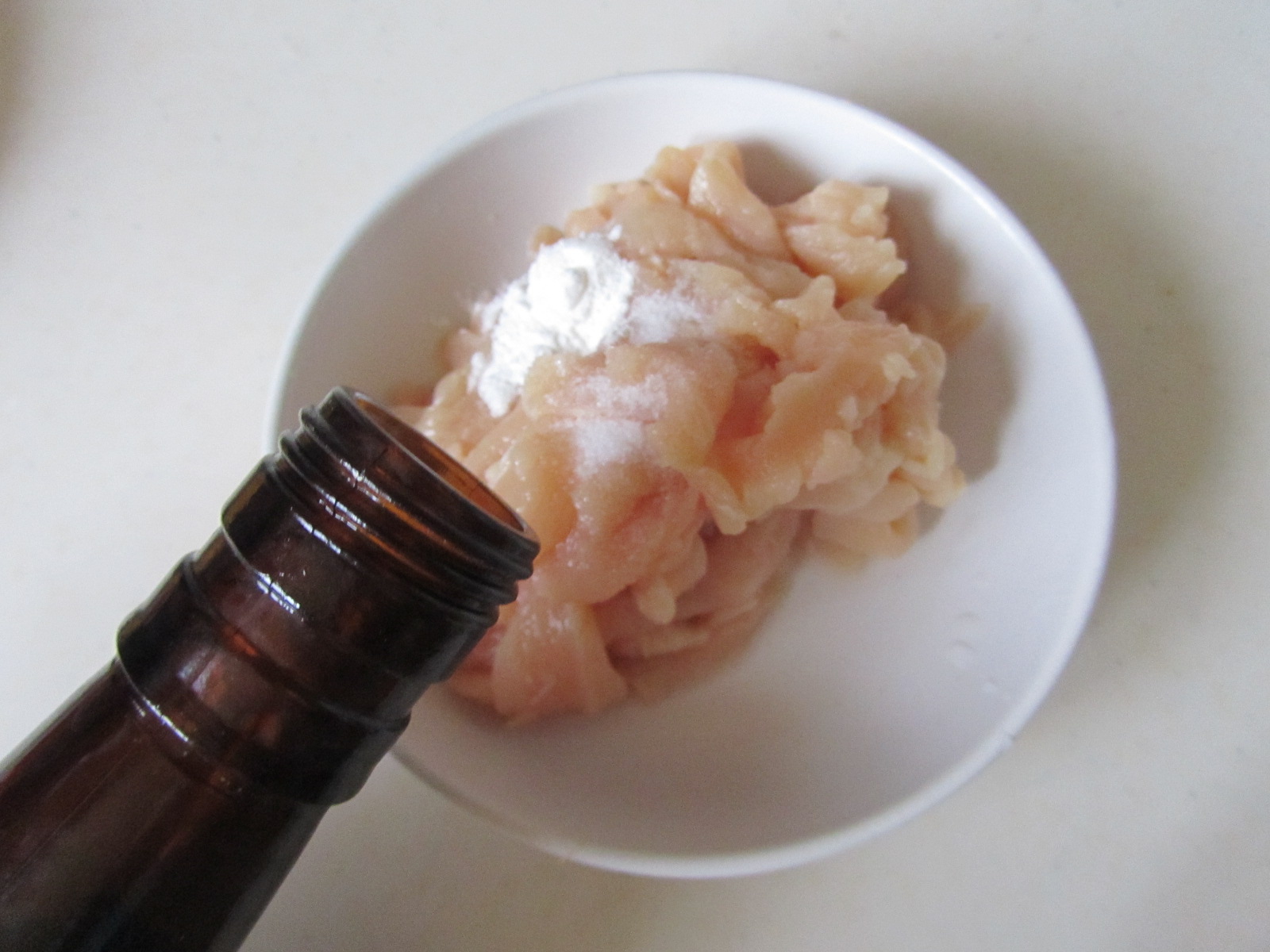2. 鸡脯肉丝加入适量的盐、淀粉和料酒, 搅拌均匀腌制一下;