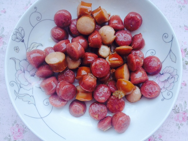 3. 热锅下油,中小火将脆皮肠炒熟。
