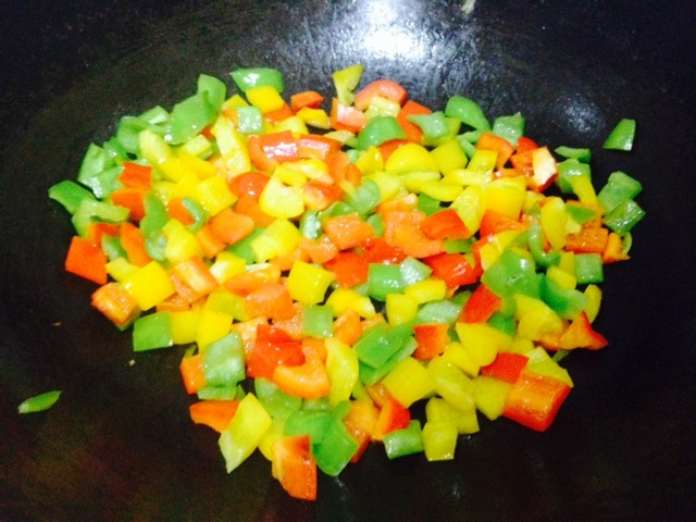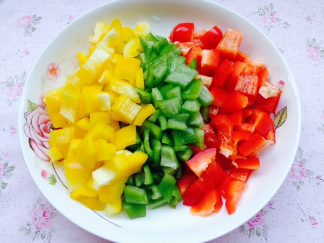 1. 青椒、黄椒、红椒切成丁。
