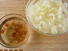2. 充分泡开后的银耳剪去根部洗净,桃胶仔细拣去杂志滤清;n