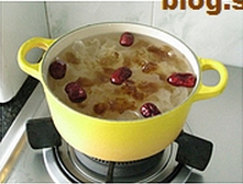 3. 锅中放入银耳、桃胶和红枣,倒入足量的清水;n